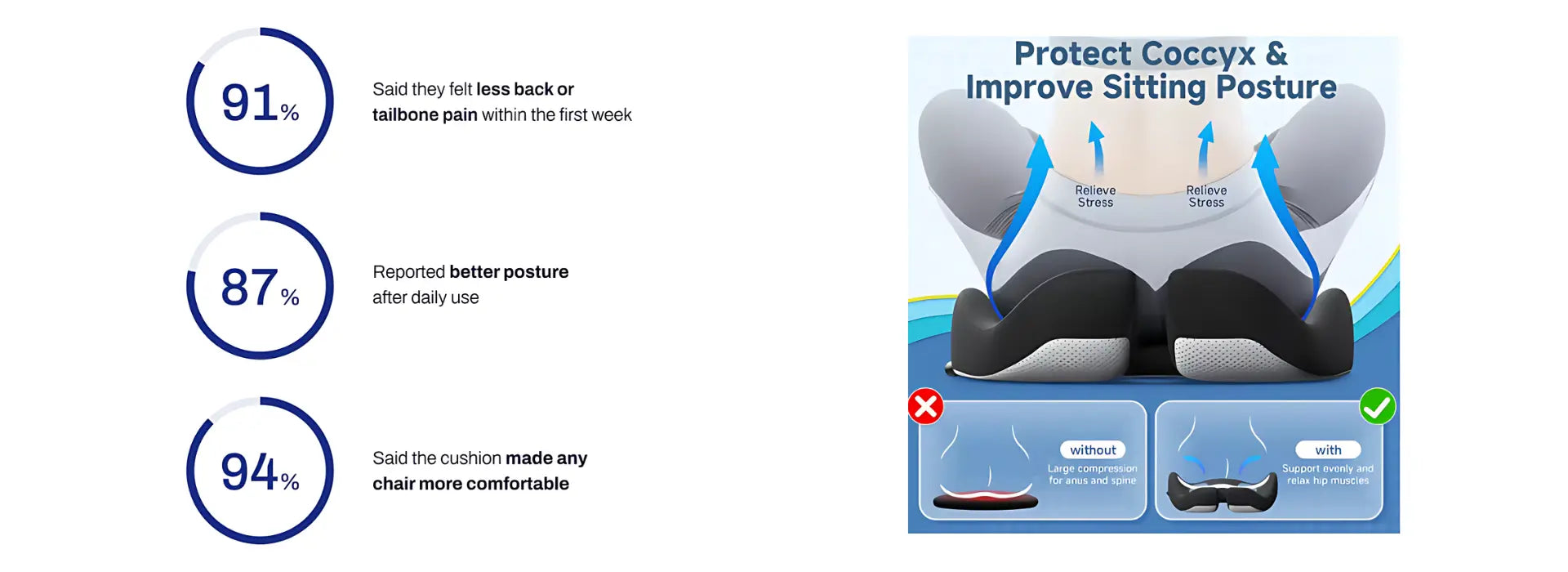 Yes! The cushion features a tailbone cutout that relieves pressure on your coccyx and spine, helping ease sciatica, hip, and lower back pain caused by sitting too long.